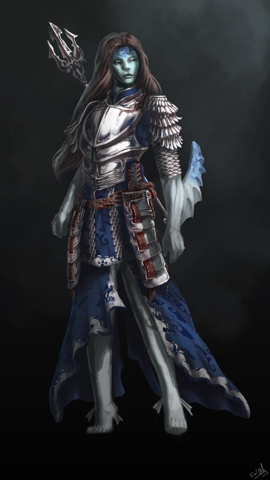 Кожа и Чешуя: Кожа влажная, гладкая, часто с перламутровым или синеватым отливом. Цвета — оттенки лазури, морской волны, серебристого, глубокого индиго, нежно-сиреневого. Чешуя у них неброская, мелкая, переливающаяся, как у рыб. Она покрывает тело по бокам, вдоль позвоночника или на конечностях, создавая красивые узоры.